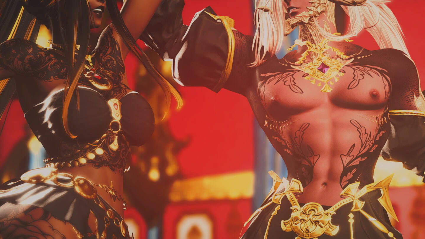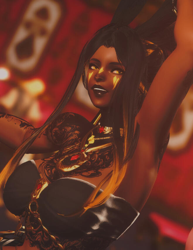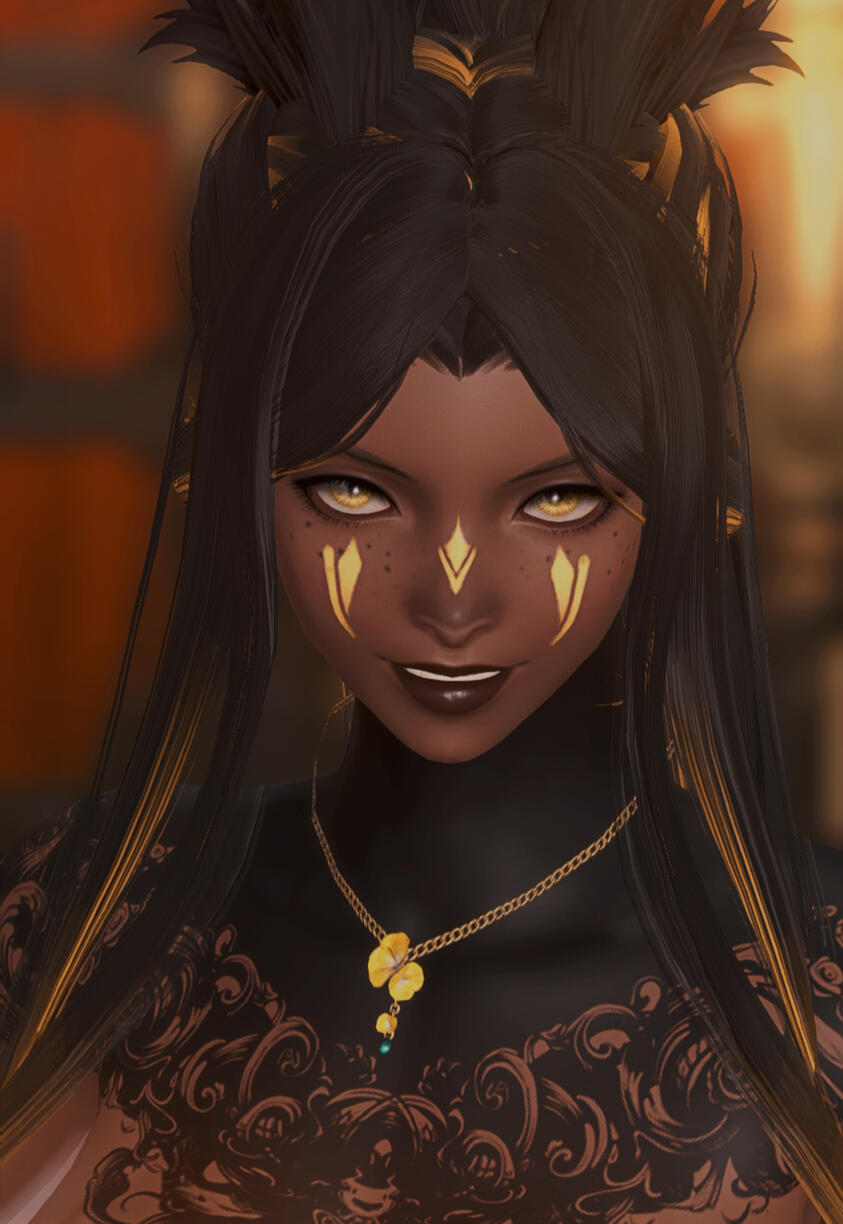 Even from a young age, Lantana was a rebellious soul. Like many Rava, she was born in the Golmore Jungle and grew up just like every Viera citizen in her village. She lived there for several years with her younger sibling - until it was revealed that her sibling was male. Despite the mantra that their matriarchal society tried so hard to get into her head, Lantana refused to give up the bond she shared with her brother. Late into the night, she followed him when his chosen mentor took him away from their village.While wholly unprepared for the hardships that male viera faced, Lantana was determined to never lose sight of her brother. For over three months, she remained hidden, utilizing her skills as a huntress to stalk the two males from the shadows. Despite her best efforts, however, she was still caught by the male that mentored her brother - who, despite tradition dictating that she should be punished and exiled, simply pretended that he had not seen her.Confused, but otherwise relieved, Lantana continued to follow them. Over time, she watched and learned from them the skills she needed to survive on her own in the world, and found that the skills came naturally to her. Not so much, however, to her younger brother, Iria. In a freak accident, Iria slipped up during a hunt and found himself at the deadly end of a viper's temper. However, the viper's fangs did not find purchase on Iria - but instead his mentor, who put himself between the young boy and the angry beast.Despite her better judgement, Lantana made the killing blow on the beast before it could cause any more harm, joining her brother by the elder male's side. In his last few moments, the elder revealed his true identity - and why he did not attack or shun Lantana when she was found. He was their sire by blood - who had eyes only for their mother in that little village in the jungle. When time it came for Iria to leave, their father jumped at the chance to become his mentor, even though the notion itself was taboo.Faced with the sudden grief of losing their father, Lantana and Iria vowed never to leave each others side if they could help it. Knowing that Lantana would be exiled or worse should she ever return home, they decided instead to make their way East, to Kugane. Life at first was tough for them, as they knew perfectly how to survive in a thick jungle - but not in a bustling city. Over time, however, they made good names for themselves. Iria found himself swept up in the arts, and found that he had a great talent in tattoos.Lantana, on the other hand, had a difficult time fitting in. Her talent in wilderness survival saw that her wanderlust would not leave her alone. She set off to explore every nook and corner that Kugane had to offer - and eventually (literally) bumped into a handsome Raen gentleman by name of Mochiuji Uzuka. Through him, she learned of the opportunity to travel as a dancer and performer, which she took in a heartbeat with her brother's blessing.As time went on, she spent much time with Mochiuji, and even put her dancing skills to the test with performances at Kuriko's Hostel. With each day passed, the two grew closer together, and it is clear to many that there was something between them from the start. However, with the nature of Mochiuji's work, and with Lantana often being away for months at a time, they agreed to keep their relationship open. There would always be a place for each other in their hearts - with room to spare, wheresoever their lives would take them.